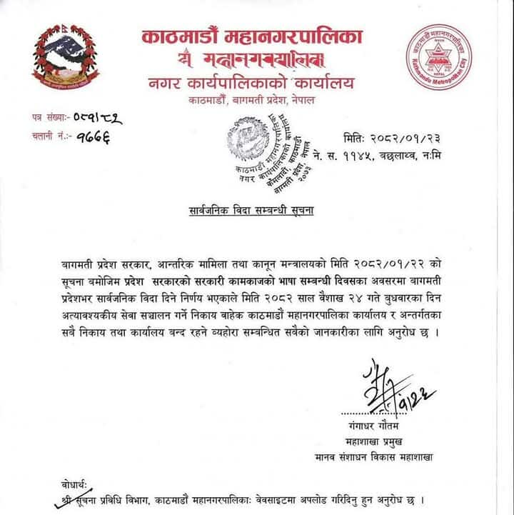 काठमाडौं । भोलि बैशाख २४ गते बागमति प्रदेशभर सार्वजनिक बिदा दिने प्रदेश सरकारको निर्णय भएको छ । भोलि प्रदेश सरकारको सरकारी कामकाजको भाष सम्बन्धी दिवसको अवसरमा बिदा दिने निर्णय भएको हो । सोही अनुरुप काठमाडौं महानगरपालिकाले एक सूचना जारी गर्दै सो अवसरमा अत्यावश्यकीय सेवा सञ्चालन गर्ने निकाय बाहेक काठमाडौं महानगरपालिका कार्यालय र अन्तर्गतका सबै निकाय तथा कार्यालय बन्द रहने जनाएको छ ।