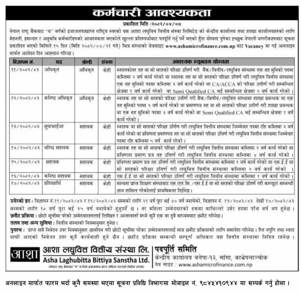 काठमाडौं । आशा लघुवित्त वित्तीय संस्थाले विभिन्न पदका लागि कर्मचारी माग गरेको छ । संस्थाले अधिकृतका लागि केही, कनिष्ठ अधिकृतका लागि केही, सुपरभाइजरका लागि केही, वरिष्ठ सहायकका लागि केही, सहायकका लागि केही, कनिष्ठ सहायकका लागि केही र प्रशिक्षार्थीका लागि केही संख्यामा कर्मचारी माग गरेको छ । कम्पनीले आफ्नो केन्द्रीय कार्यालय तथा विभिन्न शाखा कार्यालयका लागि कर्मचारी माग गरेको हो । ईच्छुक तथा योग्यता पुगेकाले साउन २१ गतेभित्र आवेदन दिनुपर्नेछ ।