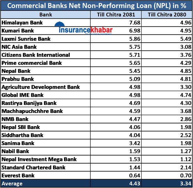 बैंकहरुले सार्वजनिक चालु आर्थिक वर्षको तेस्रो त्रैमास (साउन–चैत)सम्मको वित्तीय विवरणअनुसार २० वटा वाणिज्य बैंकहरुको औसत खराब कर्जा (एनपीएल) बढेर ४.४३ प्रतिशत पुगेको छ। अघिल्लो वर्ष औसत खराब कर्जा ३.३४ प्रतिशत थियो। अघिल्लो वर्षको तुलनामा बैंकहरुको खराब कर्जा १ प्रतिशत बढीको विन्दुले बढेको छ।