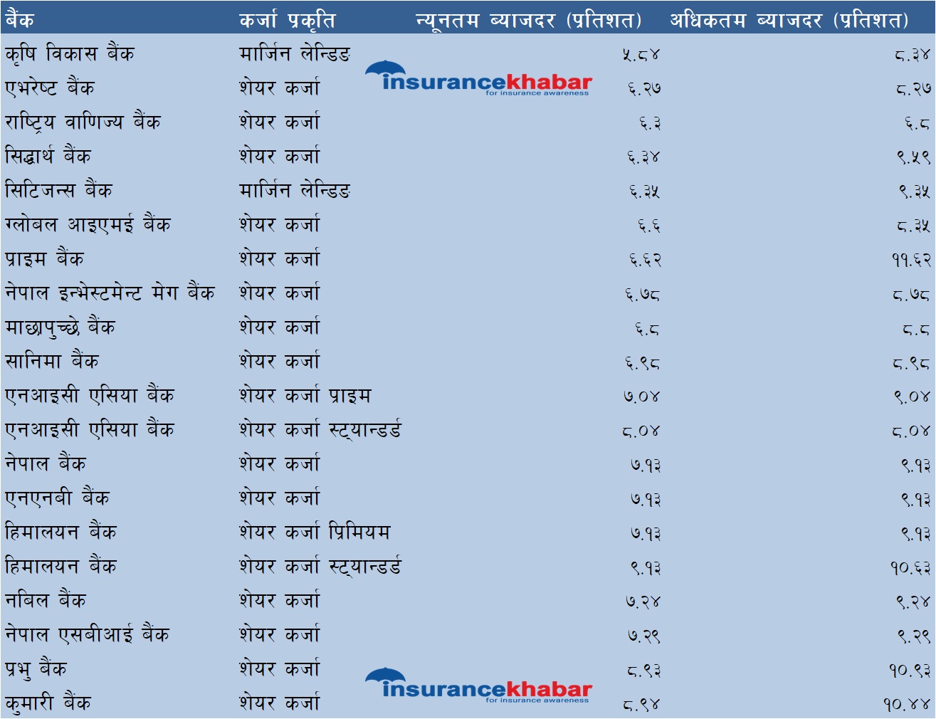 कृषि विकास बैंकले न्यूनतम ५.८४ प्रतिशतदेखि अधिकतम ८.३४ प्रतिशतसम्म ब्याजदरमा मार्जिन लेन्डिङ कर्जा दिँदै आएको छ। एभरेस्ट बैंकले ६.२७ प्रतिशतदेखि ८.२७ प्रतिशतसम्ममा शेयर कर्जा दिइरहेको छ। राष्ट्रिय वाणिज्य बैंकले ६.३ देखि ६.८ प्रतिशतसम्म, सिद्धार्थ बैंकले ६.३४ देखि ९.५९ प्रतिशतसम्म र सिटिजन्स बैंकले ६.३५ देखि ९.३५ प्रतिशतसम्म ब्याजदरमा शेयर कर्जा दिँदै आएको छ।