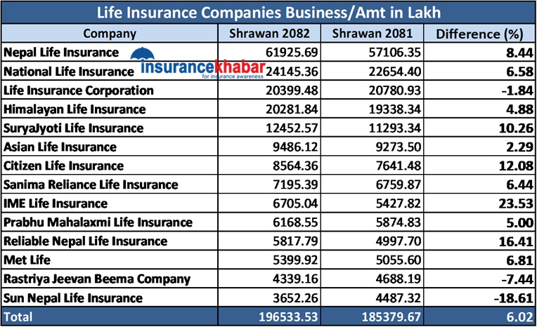 यसैगरी चालु आर्थिक वर्षको साउनमा हिमालयन लाइफले २ अर्ब २ करोड ८१ लाख रुपैयाँ, सूर्यज्योति लाइफले १ अर्ब २४ कोड ५२ लाख रुपैयाँ, एसियन लाइफले ९४ करोड ८६ लाख रुपैयाँ र सिटिजन लाइफले ८५ करोड ६४ लाख रुपैयाँ कुल बीमाशुल्क आर्जन गरेका छन्। अघिल्लो वर्षको तुलनामा हिमालयन लाइफको ४.८८ प्रतिशत, सूर्यज्योति लाइफको १०.२६ प्रतिशत, एसियन लाइफको २.२९ प्रतिशत र सिटिजन लाइफको १२.०८ प्रतिशतले व्यापार बढेको छ।