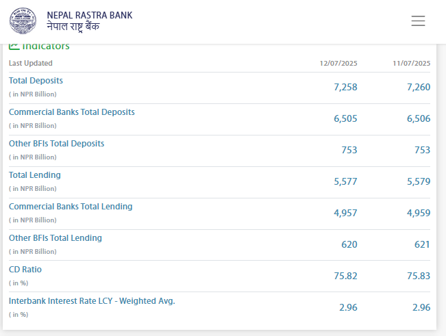 नेपाल राष्ट्र बैंकको शनिबारको तथ्यांकअनुसार बैंकहरुको औसत सीडी रेसियो ७५.८२ प्रतिशतमा झरेको छ।