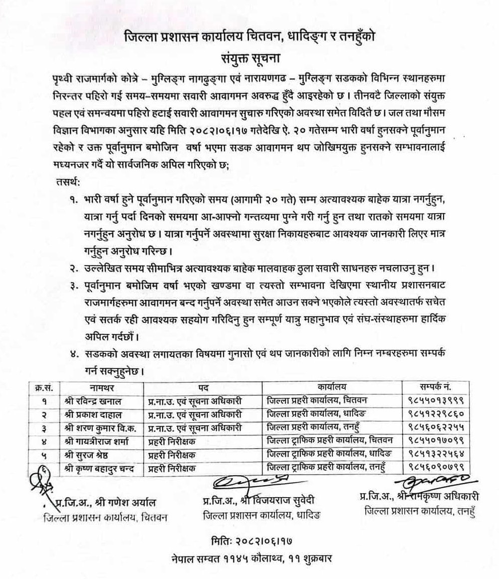तीनवटै जिल्लाका स्थानीय प्रशासनले विभागले आज असोज १७ गतेदेखि असोज २० गतेसम्म भारी वर्षा हुन सक्ने पूर्वानुमान गरको र यो पूर्वानुमानबमोजिम वर्षा भएमा सडक आवगमन थप जोखिमयुक्त हुन सक्ने सम्भावनलाई ध्यानमा राखेर यी सर्तकर्ता अपनाउनु संयुक्त रुपमा अपिल गरेका हुन्।