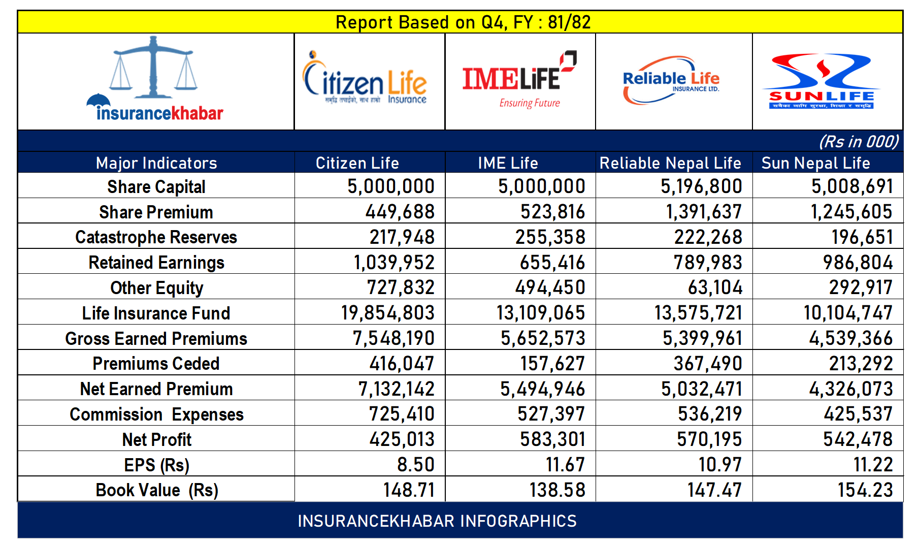 खुद बीमाशुल्क आर्जनः सिटिजन लाइफले गत आर्थिक वर्षको चौथो त्रैमाससम्म ७ अर्ब १३ करोड रुपैयाँ खुद बीमाशुल्क आर्जन गरेको छ भने आइएमई लाइफले ५ अर्ब ४९ करोड रुपैयाँ खुद बीमाशुल्क आर्जन गरेको छ। त्यस्तै, रिलायबल नेपाल लाइफले ५ अर्ब ३ करोड रुपैयाँ खुद बीमाशुल्क आर्जन गरेको छ भने सन नेपाल लाइफले ४ अर्ब ३२ करोड रुपैयाँ खुद बीमाशुल्क आर्जन गरेको छ।