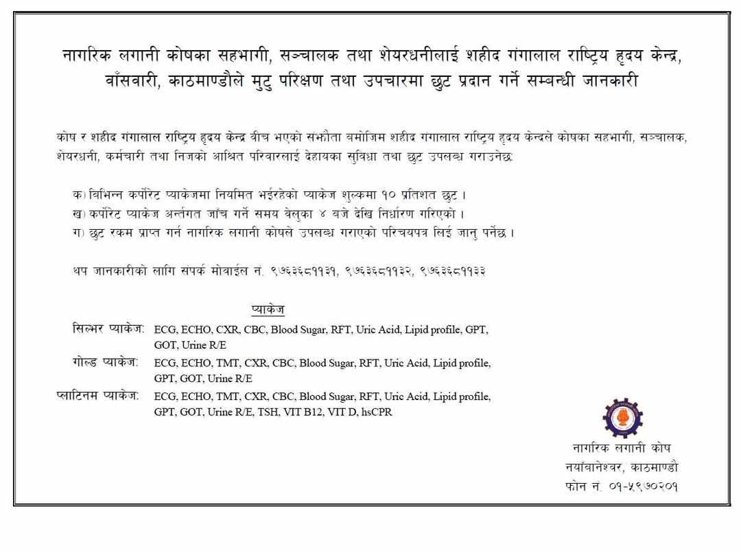 काठमाडौं । नागरिक लगानी कोषमा आबद्ध, सञ्चालक तथा शेयरधनीले शहीद गंगलाल राष्ट्रिय हृदय केन्द्रमा मुटु परीक्षण तथा उपचार गराउँदा छुट पाउने भएका छन् । विभिन्न कर्पोरेट प्याकेजमा नियमित भइरहेको प्याकेज शुल्कमा १० प्रतिशत छुट दिने जनाइएको छ । कर्पोरेट प्याकेज अन्तर्गत जाँच गर्ने समय बेलुका ४ बजेबाट निर्धारण गरिएको छ । छुट रकम प्राप्त गर्न नागरिक लगानी कोषले उपलब्ध गरिएको परिचयपत्र लिइ जानुपर्नेछ ।
