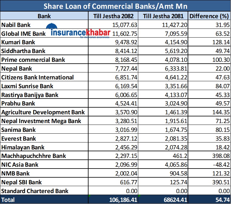 नेपाल राष्ट्र बैंकले सार्वजनिक गरेको तथ्यांकअनुसार हाल सञ्चालनमा रहेका २० वटामध्ये १९ वटा वाणिज्य बैंकले जेठसम्म १ खर्ब ६ अर्ब १८ करोड ६४ लाख रुपैयाँ शेयर लोन प्रवाह गरेका हुन्। अघिल्लो वर्ष यही अवधिसम्म बैंकहरुले ६८ अर्ब ६२ करोड ४४ लाख रुपैयाँ शेयर लोन प्रवाह गरेका थिए। अघिल्लो वर्षको तुलनामा शेयर लोनको माग ५४.७४ प्रतिशतले बढेको छ।