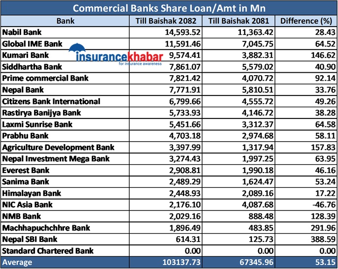यसैगरी यो वर्ष वैशाखसम्म सिद्धार्थ बैंकबाट ७ अर्ब ८६ करोड १० लाख रुपैयाँ, नेपाल बैंकबाट ७ अर्ब ७७ करोड १९ लाख रुपैयाँ, प्राइम कमर्सिल बैंकबाट ७ अर्ब ८२ करोड १४ लाख रुपैयाँ, सिटिजन्स बैंकबाट ६ अर्ब ७९ करोड ९६ लाख रुपैयाँ, राष्ट्रिय वाणिज्य बैंकबाट ५ अर्ब ७३ करोड ३९ लाख रुपैयाँ र लक्ष्मी सनराइज बैंकबाट ५ अर्ब ४५ करोड १६ लाख रुपैयाँ शेयर लोन गएको छ। अघिल्लो वर्षको यही अवधिसम्मको तुलनामा सिद्धार्थको शेयर लोन प्रवाह ४०.९० प्रतिशत, प्राइमको ९२.१४ प्रतिशत, नेपाल बैंकको ३३.७६ प्रतिशत, सिटिजन्सको ४९.२६ प्रतिशत, राष्ट्रिय वाणिज्य बैंकको ३८.२८ प्रतिशत र लक्ष्मी सनराइजको ६४.५८ प्रतिशतले बढेको छ।