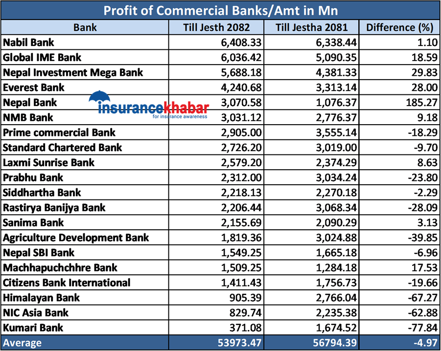 समीक्षा अवधिसम्म ९ वटा बैंकको नाफा बढेको छ भने ११ वटाकै घटेको छ। समीक्षा अवधिसम्म सर्वाधिक नाफा कमाउने नबिल बैंक अग्रस्थानमा रहेको छ। नाफा वृद्धिको हिसाबले नेपाल बैंक अगाडि रहेको छ।