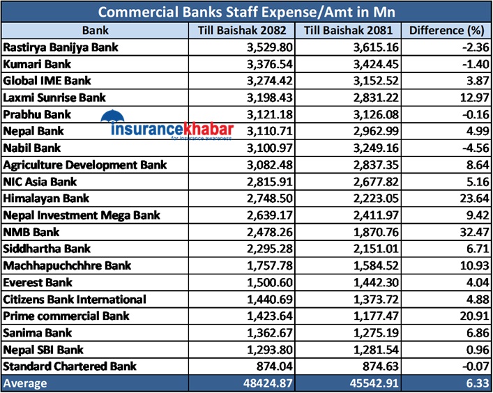 कर्मचारीको तलबभत्तामा सबैभन्दा धेरै खर्च गर्नेमा राष्ट्रिय वाणिज्य बैंक रहेको छ भने वृद्धिदरको हिसाबले एनएमबि बैंक अगाडि रहेको छ। अघिल्लो वर्षको तुलनामा १५ वटा वाणिज्य बैंकको कर्मचारीको तलबभत्तामा जाने खर्च बढेको छ भने ५ वटाको घटेको छ।