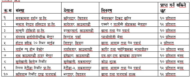 सम्झौता पश्चात महालक्ष्मी विकास बैंकका डेबिट अथवा क्रेडिट कार्ड तथा मोबाइल बैंकिङ्ग प्रयोग गर्ने ग्राहकहरुले उक्त संस्थाहरुका विभिन्न सेवाहरुमा विशेष छुट प्राप्त गर्न सक्नेछन् । उक्त संस्थाहरु र प्राप्त गर्न सकिने छुट निम्न लिखित छन्ः