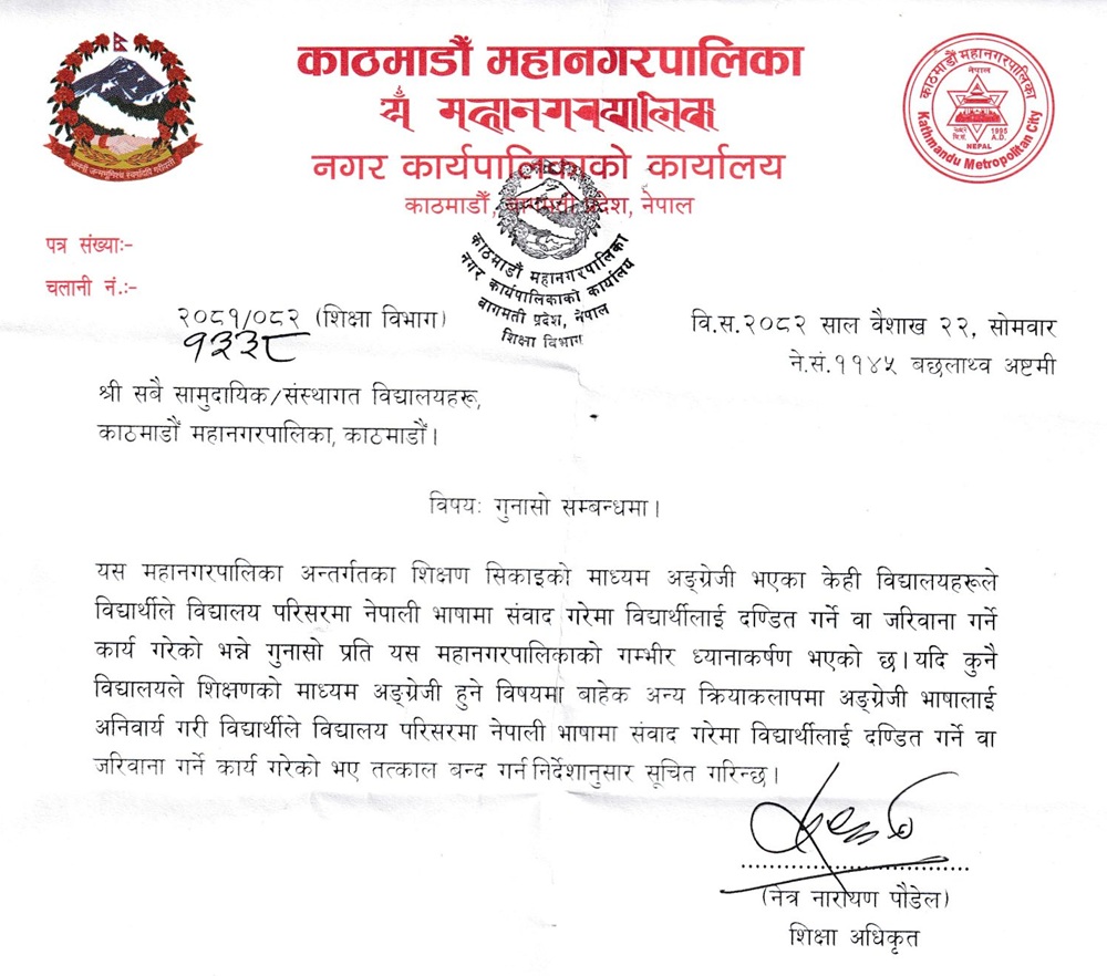 महानगरपालिकाले आज नगरक्षेत्रका सबै सामुदायिक तथा संस्थागत विद्यालयका नाममा परिपत्र जारी गर्दै यस्तो निर्देशन दिएको हो। शिक्षण सिकाइका माध्यम अंग्रेजी भएका केही विद्यालयले विद्यार्थीले विद्यालय परिसरमा नेपाली भाषामा संवाद गरेमा विद्यार्थीलाई दण्डित गर्ने वा जरिवाना गर्ने कार्य गरेको भन्ने गुनासोप्रति गम्भीर ध्यानाकर्षण भएको परिपत्रमा उल्लेख छ।