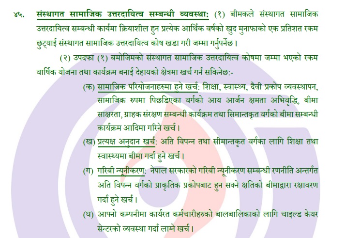 The Authority has added clause (e) after clause (d) of sub-section (2) of Clause 45 of the Directive, 2080. Clause (e) of the bill states that the insurer can now contribute financial assistance to the fund established by the Government of Nepal for the reconstruction, economic recovery and relief of the damages caused by natural disaster, civil movement, public demonstration or any other cause. Earlier, this provision was not included in the guideline.