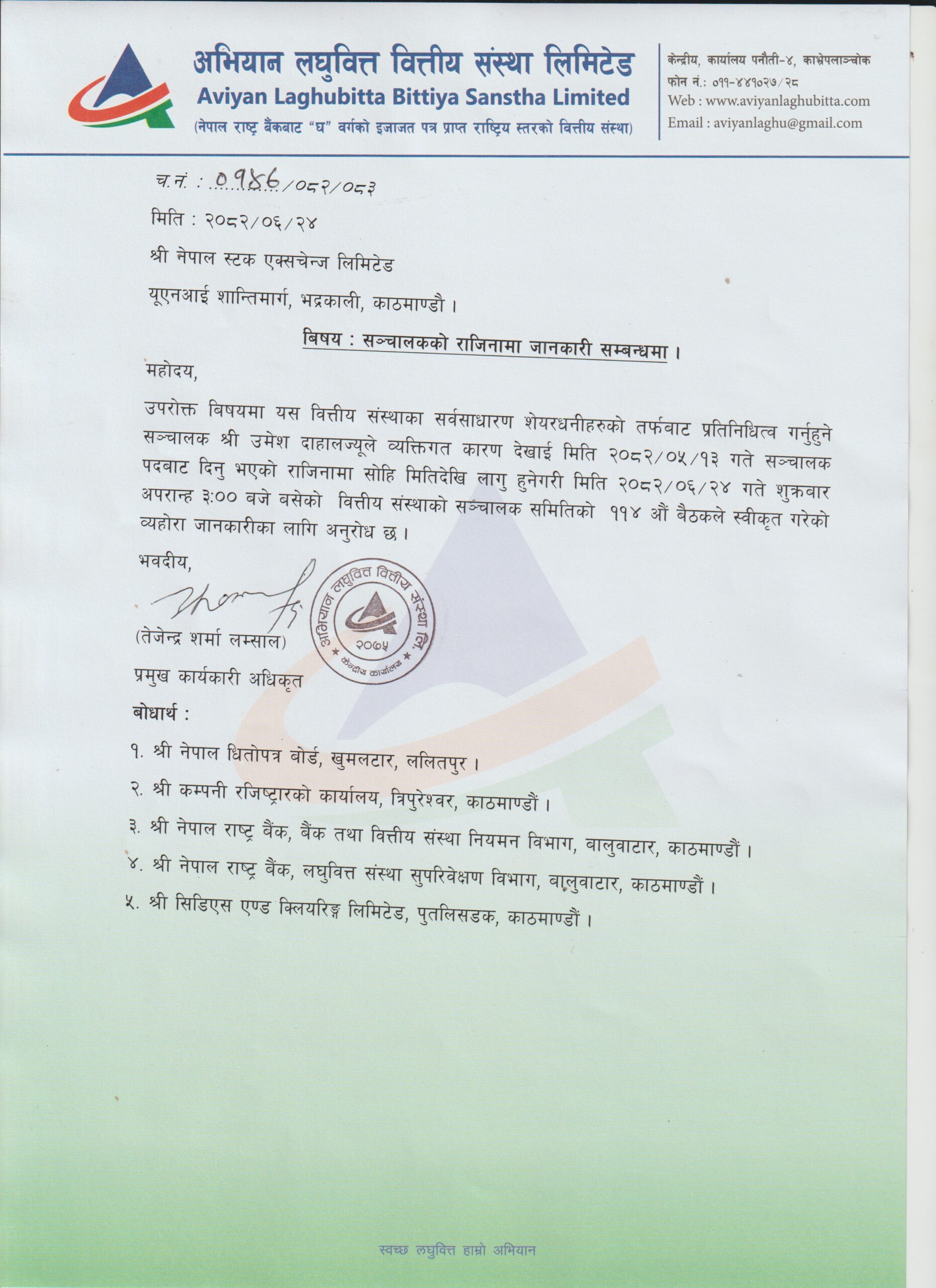 Kathmandu. Umesh Dahal, director of Abhiyan Laghubitta Bittiya Sanstha Limited, has resigned from his post. Dahal, who has been representing the general shareholders of the company, had resigned from the post citing personal reasons. Yes. His resignation was accepted on September 9 last year.
