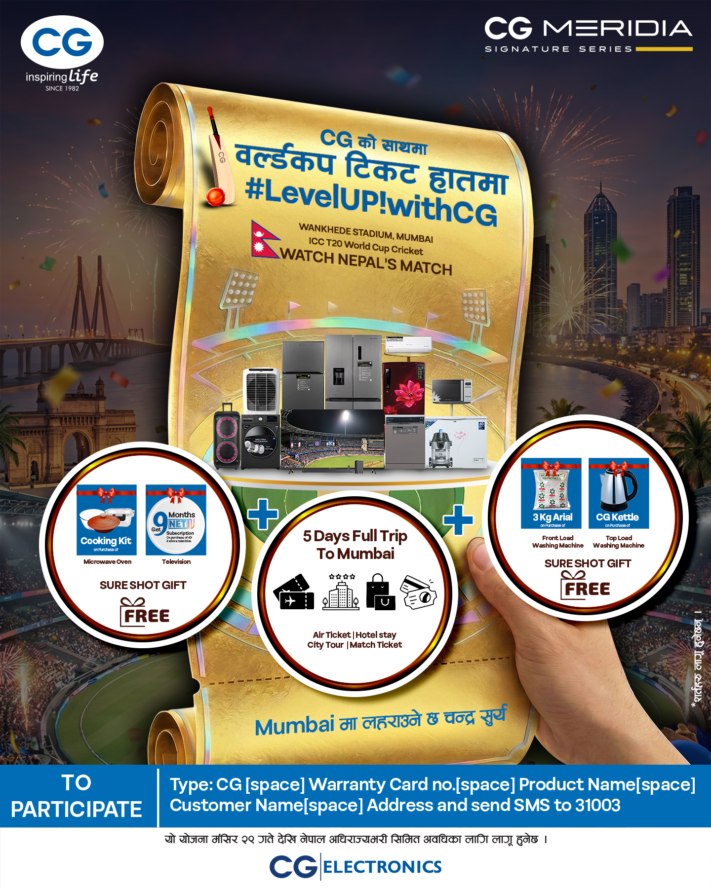 Kathmandu. Now, to take the excitement of the T20 World Cup to a new height, CG, one of the most trusted brands of Nepal, has launched its new gift scheme with the slogan ““#LevelUP!withCG}.