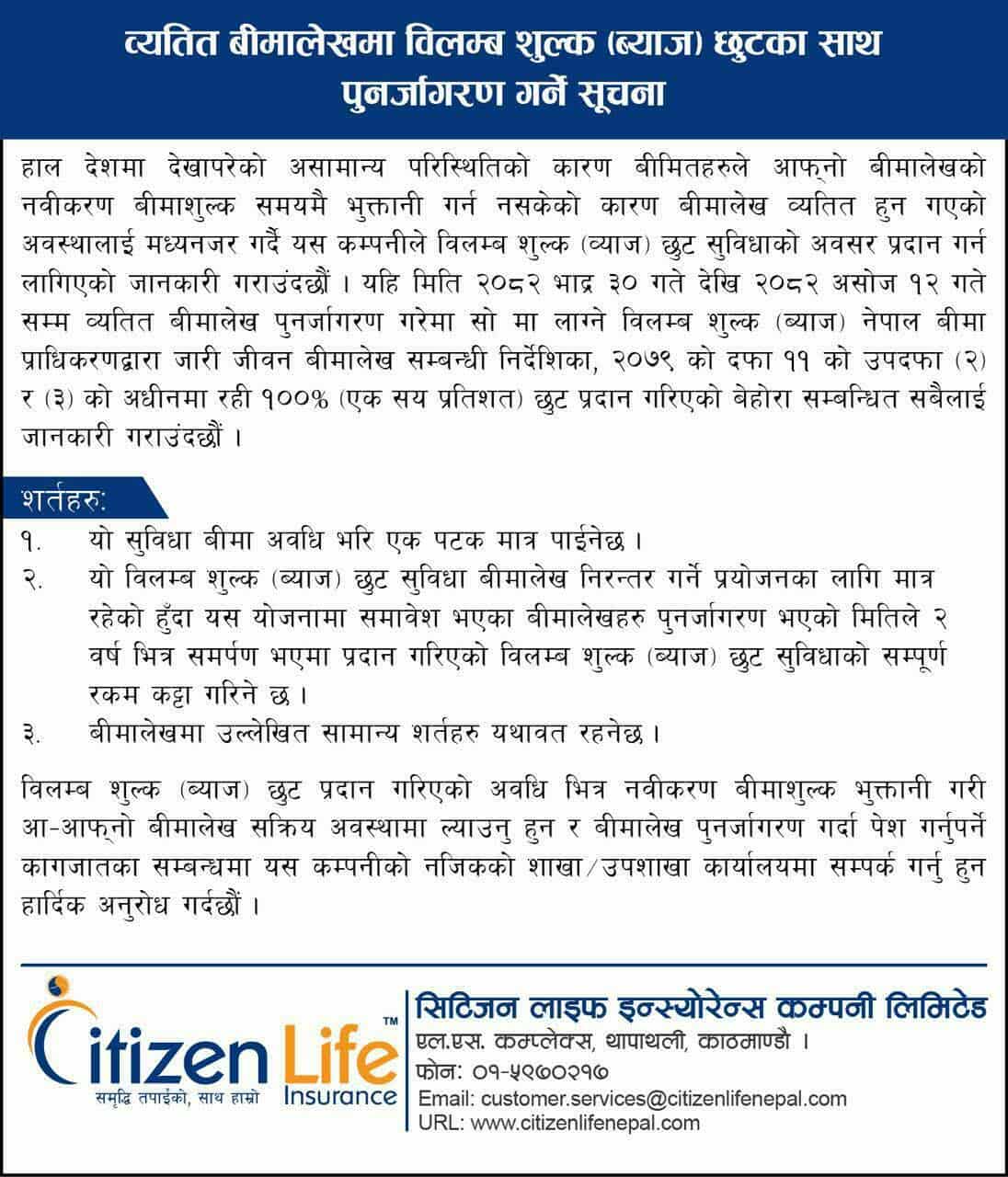 Kathmandu. KATHMANDU: Citizen Life Insurance Company (NIC) has decided to waive the interest on the late fee for renewal of the policy. The company has introduced the discount scheme considering the unusual situation that has emerged in the country at present.