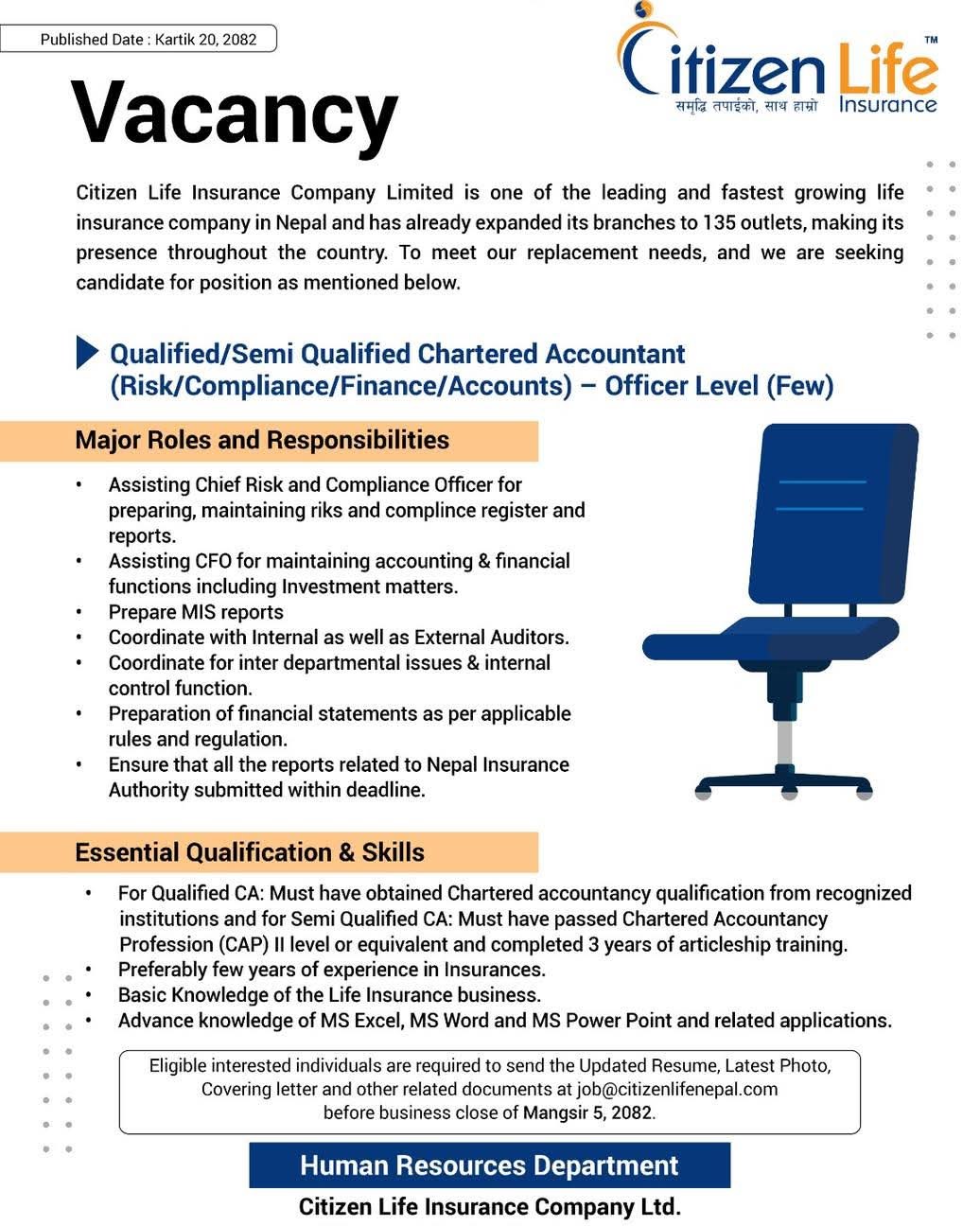 Kathmandu. Citizen Life Insurance Company has asked for employees. The company has asked for officer level employees in Qualified and Semi-Qualified Chartered Accountants. Candidates should have experience working in the relevant field to apply for the post. Those interested and eligible should apply before November 20.