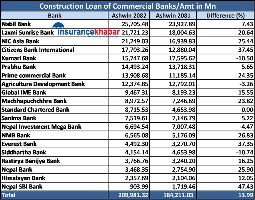 Compared to the previous year, the credit investment of 15 banks in the construction sector increased while five decreased. As of mid-September of the current fiscal year, Nabil Bank has invested the most in the construction sector, followed by Citizens Bank and Everest Bank in terms of growth rate.