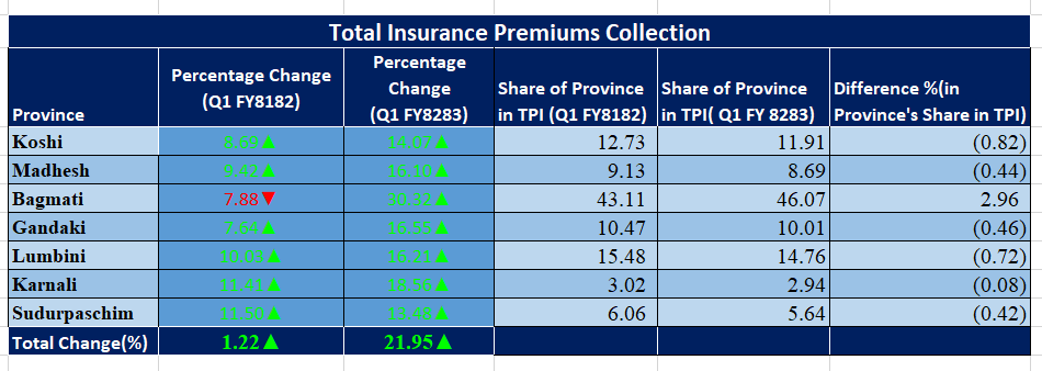 The share of Bagmati in total insurance premium collection increased by 2.96 percent to 46.07 percent in the first quarter of the last fiscal year. The contribution of the remaining six provinces has been reduced from 0.08 percent to 0.82 percent while the Bagmati Province has increased its share by 3 percent. Bagmati has the highest contribution while Karnali has the lowest contribution of 2.94 per cent.
