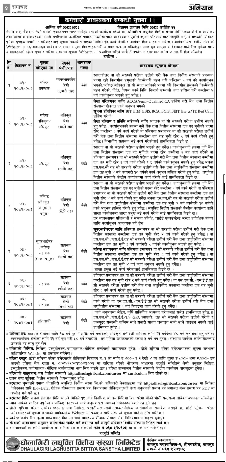 Kathmandu. Dhaulagiri Laghubitta Bittiya Sanstha has invited applications for various posts. The organization has asked for some employees for senior managers, some for senior officers, some for officers, some for junior officers, some for supervisors, some for senior assistant section heads, some for junior assistants and some for trainees.