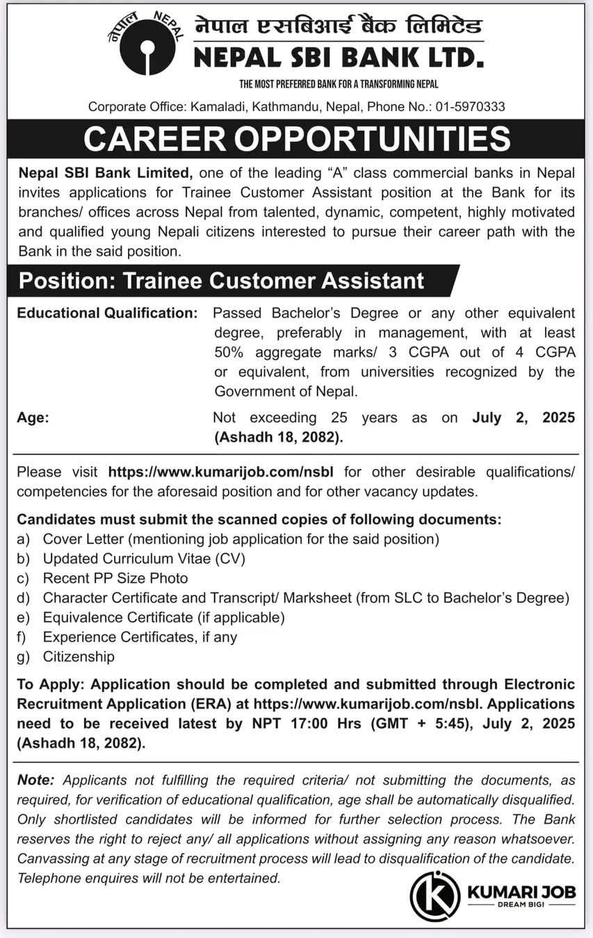 Kathmandu. Nepal SBI Bank has asked for employees. The bank has asked for employees for the post of trainee customer assistant. To apply for this post, you must have a bachelor’s and master’s degree. Interested and qualified candidates will have to apply by July 15.