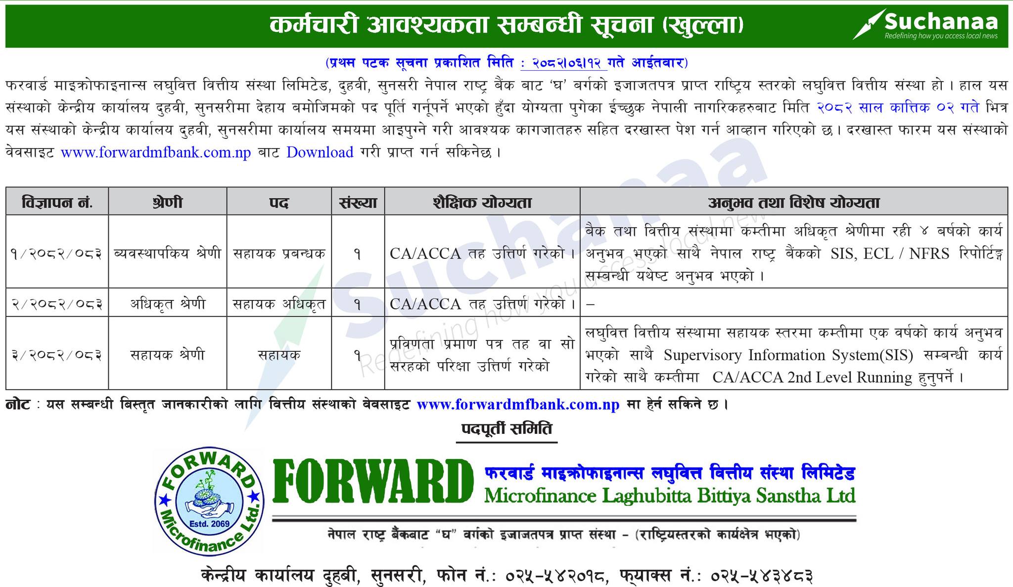 Kathmandu. Forward Microfinance has asked for employees for various positions. The company has asked for 1 assistant manager, 1 assistant officer, 1 assistant and 1 assistant. The company has asked for employees for its central office and branch office. Those interested and eligible should apply by October 2.