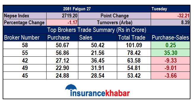 On a day when a transaction of Rs 8.39 billion was made in the market, the highest amount of transaction was made by broker number 58. This broker has done a transaction of Rs 1.19 billion. In which there is a purchase of Rs 506.7 million and a sale of Rs 504.2 million.