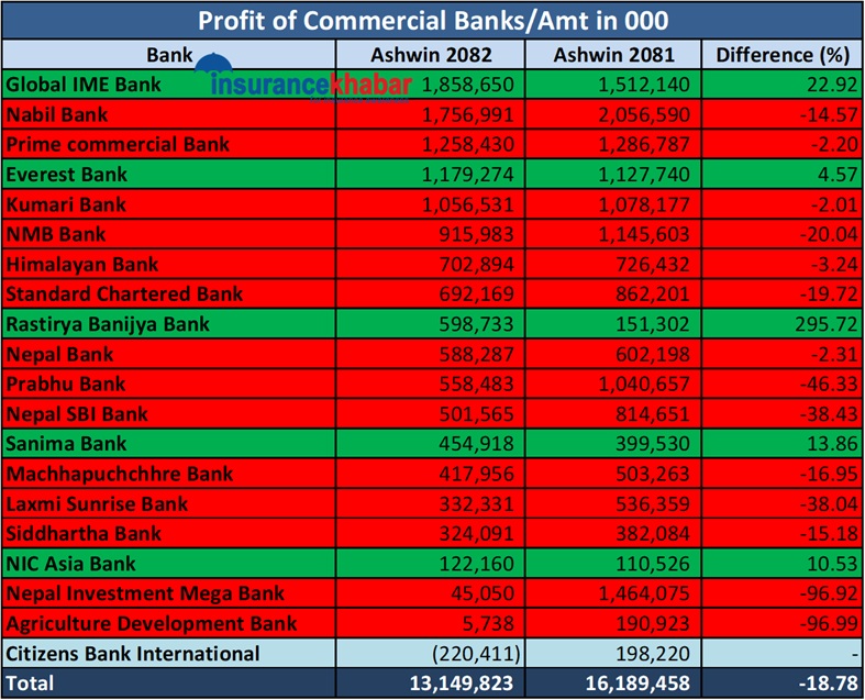 According to the financial report, the profit of only five banks has increased while the profit of 14 banks has decreased. Citizens Bank has incurred losses. In the first quarter, there are 5 banks that made a profit of over Rs billion, while Rastriya Banijya Bank is in the top position in terms of growth rate.