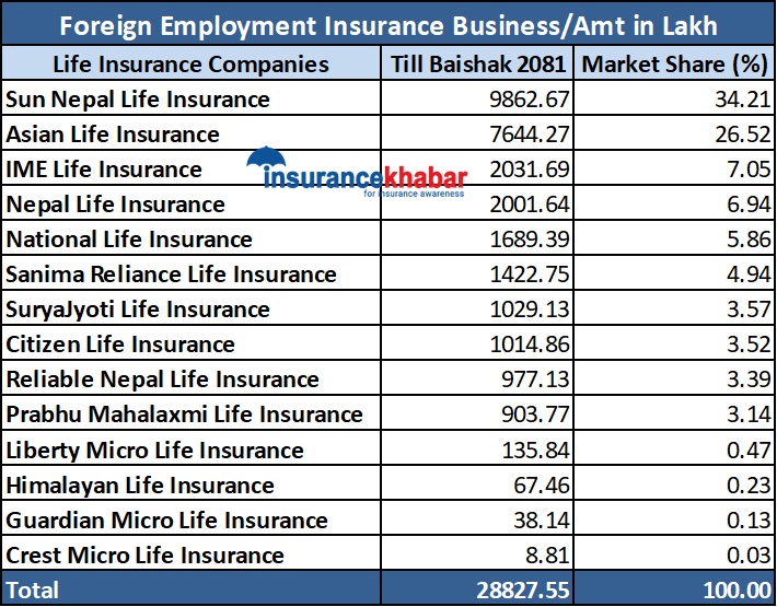 Nepal Life Insurance has sold foreign employment policies worth Rs 201 million (6.94 per cent), National Life Insurance Rs 168.9 million (5.86 per cent), Sanima Reliance Life Insurance Rs 142.2 million (4.94 per cent), Suryajyoti Life Insurance Rs 102.9 million (3.57 per cent), Citizen Life Insurance Rs 101.4 million (3.52 per cent) and Reliable Nepal Life Insurance Rs 97.7 million (Rs 97.7 million). Percent) has earned total insurance fees.