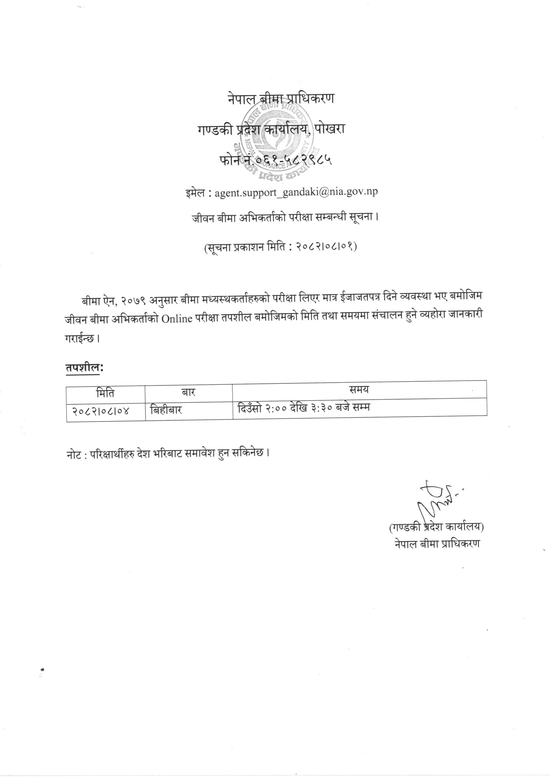 Kathmandu. Nepal Insurance Authority (NEA) Gandaki state is to conduct agent examination. The authority has stated that the examination will be conducted on November 4, Thursday. The exam will be held from 2:00 pm to 3:30 pm on Thursday.