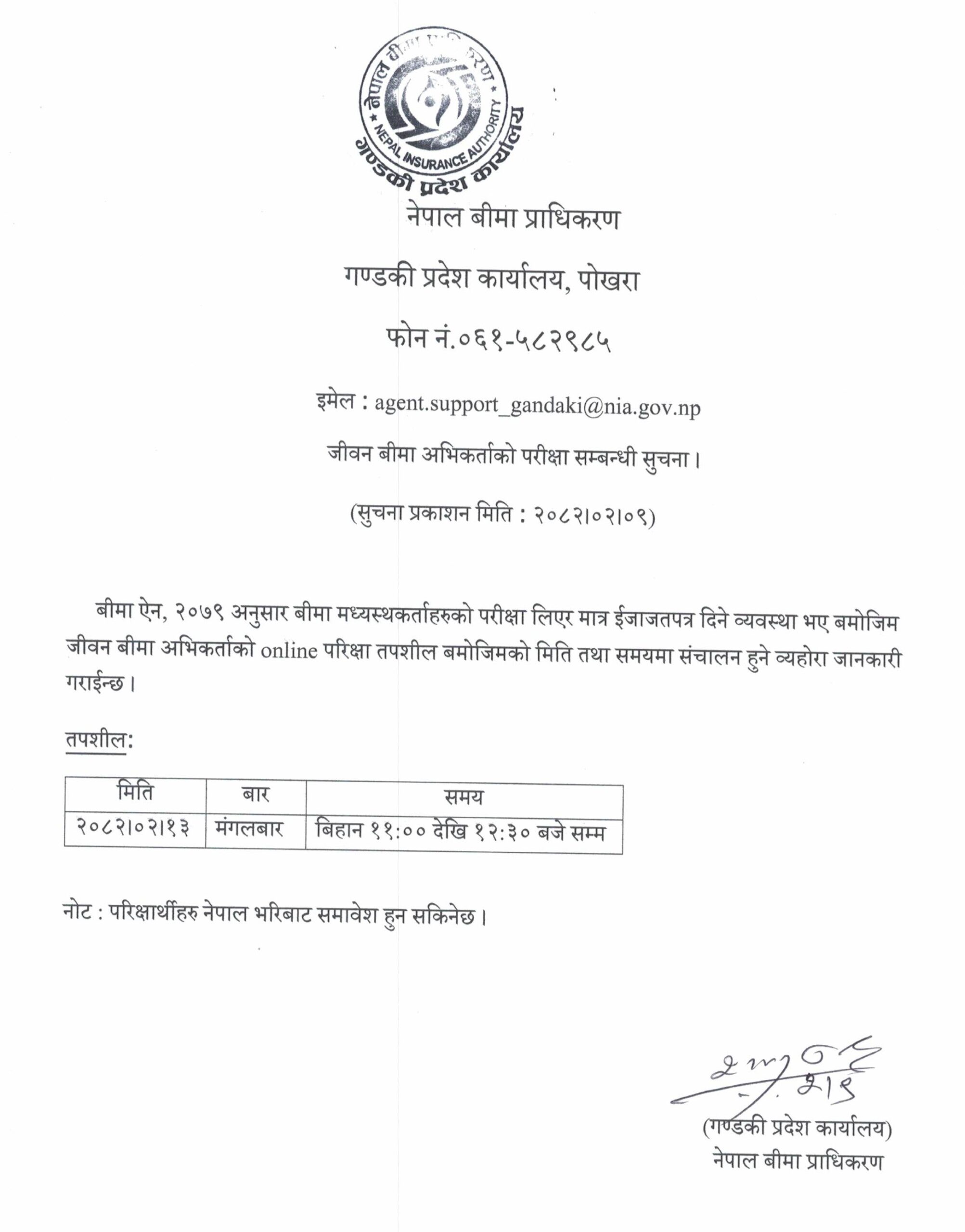 Kathmandu. Gandaki State Office of Nepal Insurance Authority(NEA), Pokhara is conducting the life insurance agent examination from Tuesday. The exam will be conducted from 11 am to 12.30 pm on Tuesday.