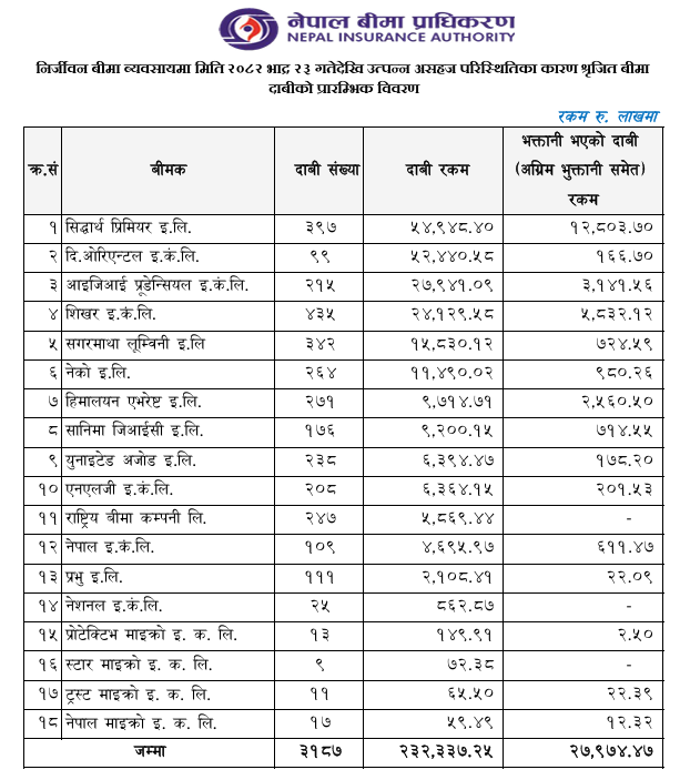 So far, IGI Preliminary Insurance has to pay Rs 2.79 billion for 215 claims, Shikhar Insurance has to pay Rs 2.41 billion for 435 claims, Sagarmatha Lumbini Insurance has to pay Rs 1.58 billion for 342 claims and Neco Insurance has to pay Rs 1.14 billion for 264 claims.