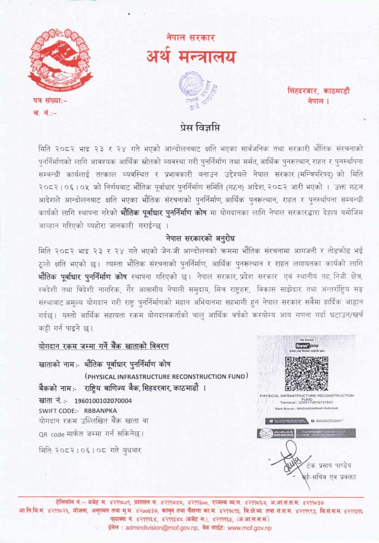 The Ministry of Finance has set up the fund to provide reconstruction, economic recovery and relief after the physical structures of the Jenji movement were torched and vandalized. The Ministry has appealed to the Government of Nepal, provincial and local governments, private sector, domestic and foreign citizens, the Non-Resident Nepali community, friendly countries, development partners and international organizations to participate in the great campaign of nation reconstruction.