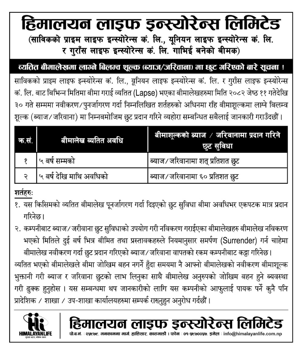 Kathmandu. Himalayan Life Insurance has decided to provide up to 100 percent discount on the late fee charged on the insurance policy. Prime Life Insurance, Union Life Insurance and Gurans Life Insurance have provided exemption on interest penalty on insurance policies that have been insured at different times.
