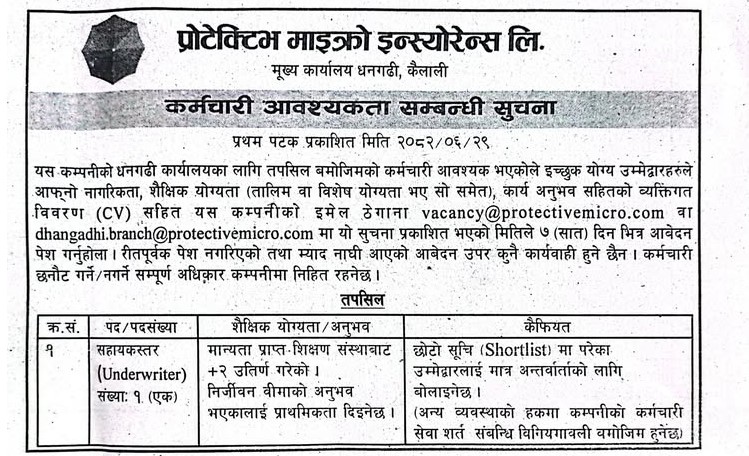Kathmandu. Protective Micro Insurance has asked for employees. The company has asked for 1 employee for the assistant level. Applicant should have passed Plus Two from a recognized educational institution and should have worked in the non-life insurance sector. The eligible candidates can apply to the post through the prescribed format within 7 days from the date of publication of the notice.