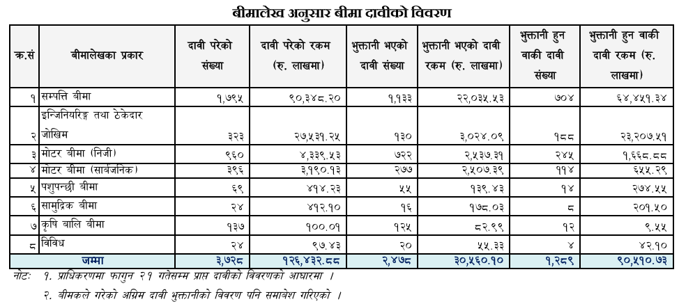According to the Nepal Insurance Authority, as of Falgun 21, 14 non-life insurers and 4 small non-life insurers have filed 3,728 claims. The companies have to pay Rs 12.64 billion and 3.2 billion more for those claims. So far, insurers have paid Rs 3.56 billion out of 2,478 claims.
