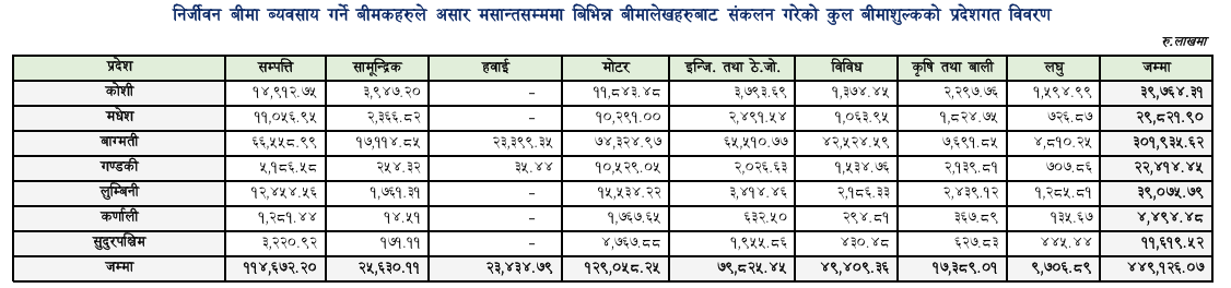 In the last fiscal year, 14 non-life insurance companies and four small non-life insurance companies sold 3,244,383 insurance policies and earned a total of Rs 44.91 billion in insurance premiums. According to the state-wise, non-life insurers have brought the most business from Bagmati. From Bagmati, the companies have collected Rs 30.19 billion in insurance premium by selling 1.4million insurance policies. This is 67.23 percent of the total trade.