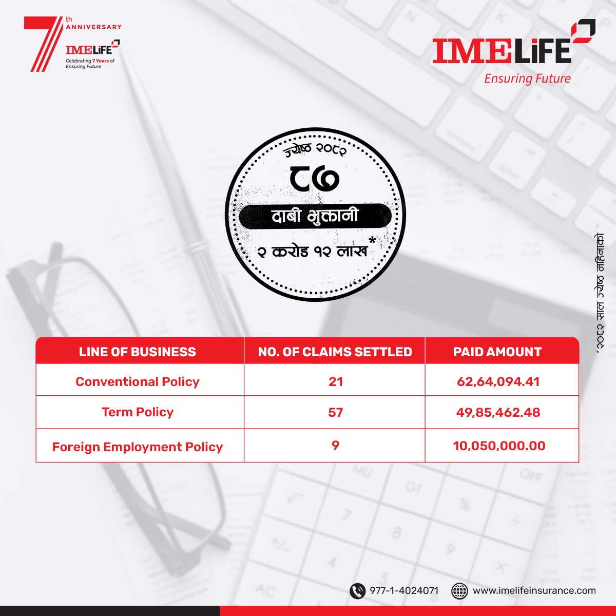 Kathmandu. IME Life Insurance Company has paid claims worth Rs 21.2 million in the month of May. The company has paid the claim for 87 insurance policies.