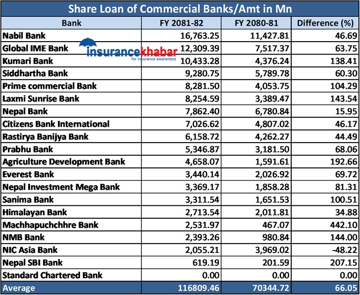 Kathmandu. Commercial banks last fiscal year 2081. More than Rs 116 billion has been disbursed as share loan in 1982.