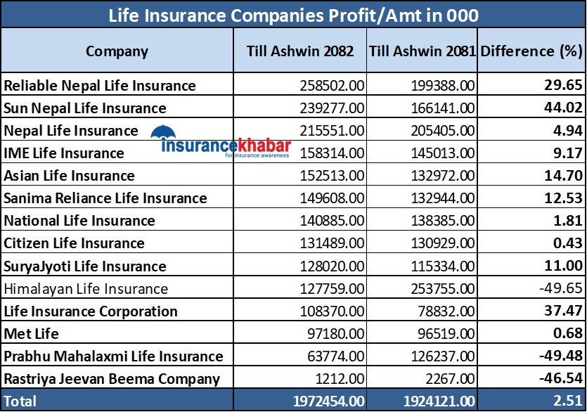 However, Nepal Life Insurance Insurance, Sun Nepal Life Insurance, Nepal Life Insurance Limited, IME Life Insurance, Sanima Life Insurance, National Life Insurance Insurance, Surya Jyoti Life Insurance and MetLife Insurance earned a profit so far. Profit of Himalayan Life Insurance Companies, Prabhu Mahalaxmi Life Insurance and Rastriya Life Insurance Company has decreased.