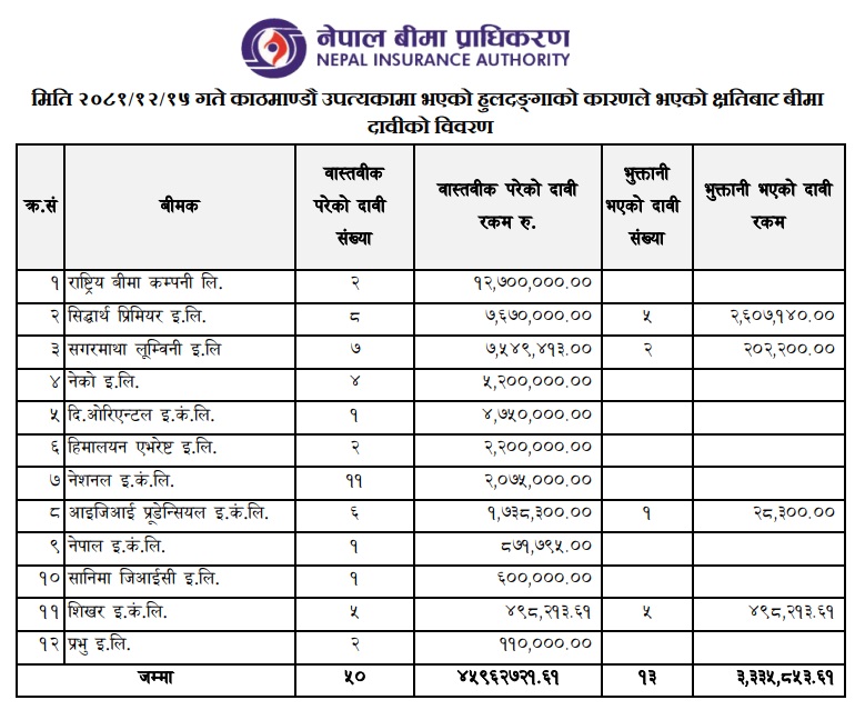 The Nepal Insurance Authority (NEA) has made public the data received from the insurers till April 15, 2018, adding that 50 claims have been filed in 12 insurance companies for the damage caused due to the riots. The claim companies have to pay Rs 45.96 million.