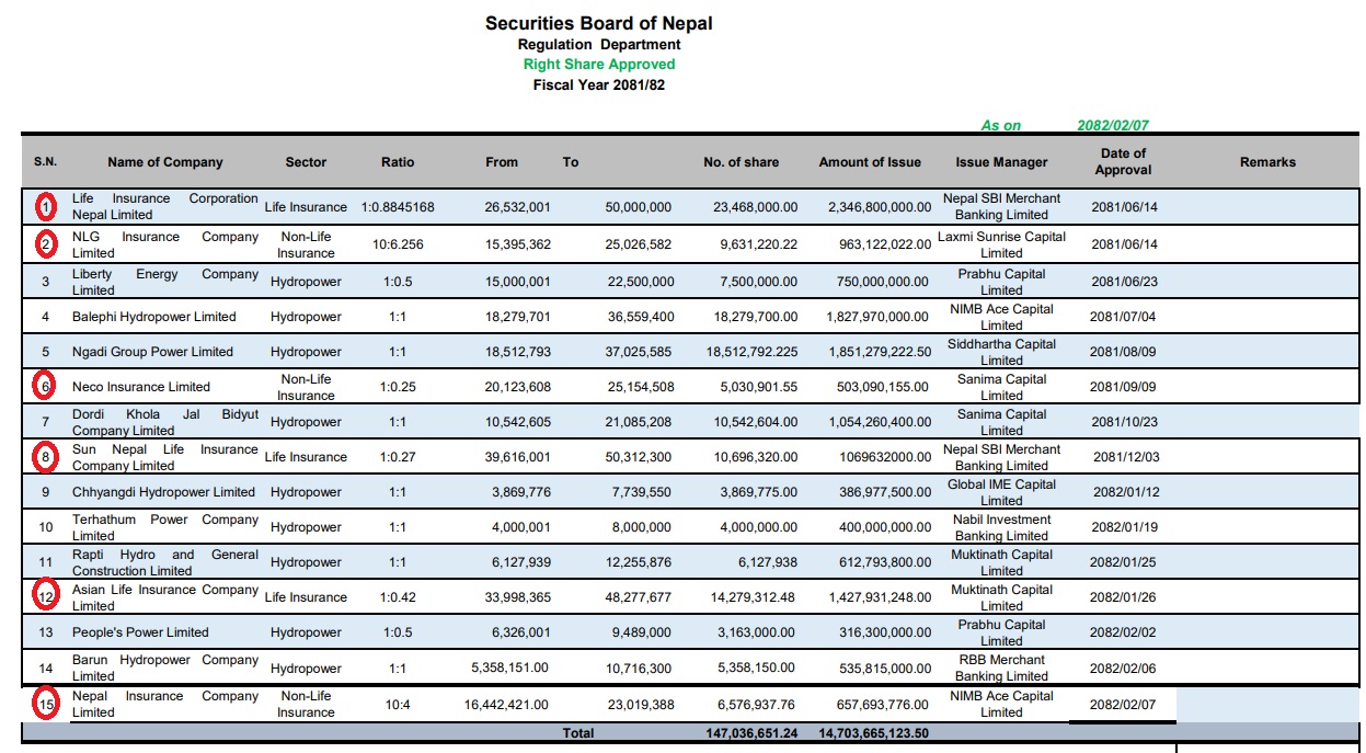 Similarly, the Securities Board of Nepal has already given permission to issue right shares of NLG Insurance, Neco Insurance and Nepal Insurance under non-life insurance. Out of these, NLG Insurance has issued right shares worth Rs 963.12 million with 62.65 percent of the paid-up capital and Neco Insurance has issued right shares worth Rs 503 million 90 thousand 155 with 25 percent of the paid-up capital.
