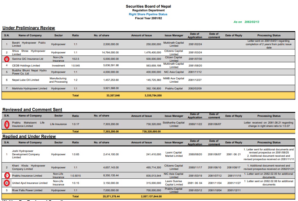 Similarly, three non-life insurance companies and one life insurance company have right shares in the pipeline of the Securities Board. Among them, Sanima GIC, Prabhu and United Ajod are in the non-life insurance category and Prabhu Mahalakshmi in the life insurance category.