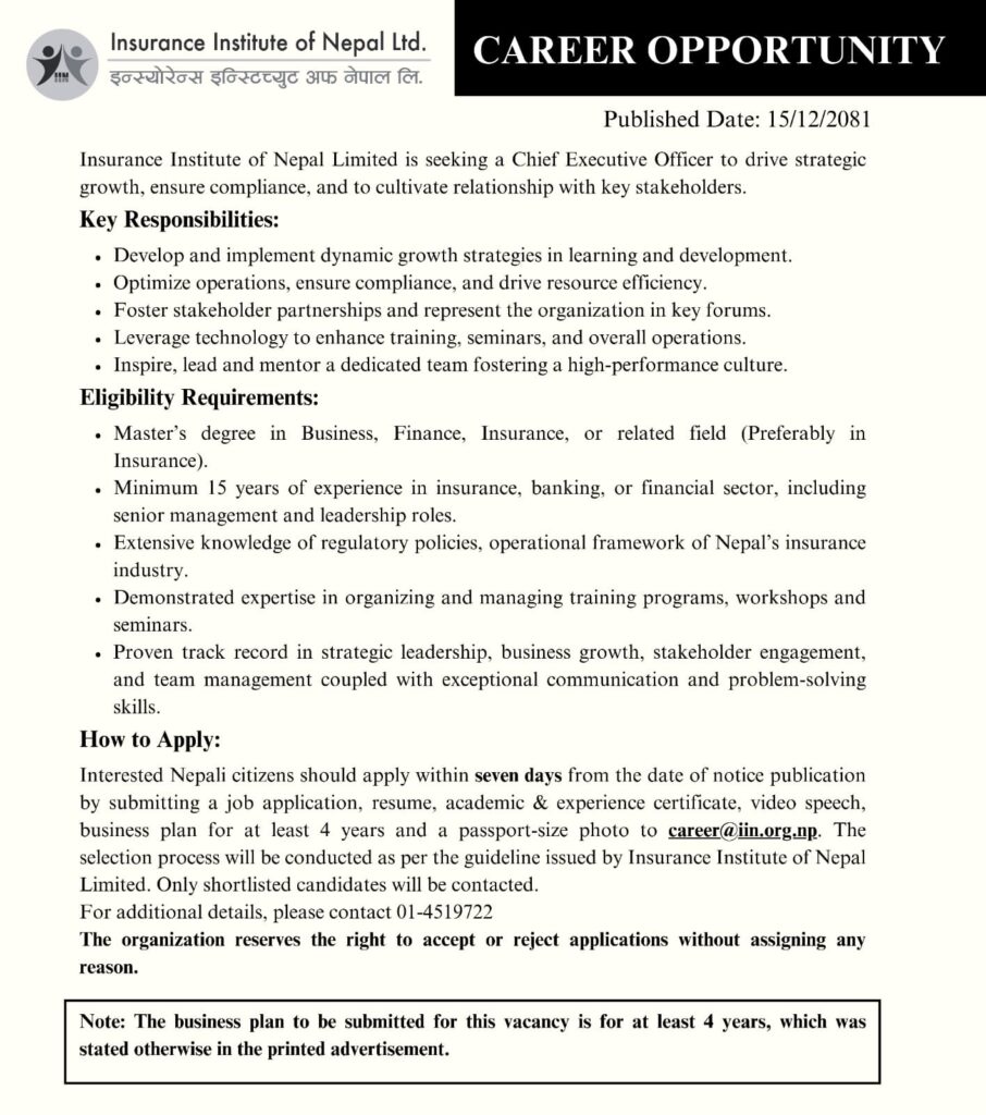 Kathmandu. Insurance Institute Nepal has published an advertisement for the appointment of Chief Executive Officer. The institute has published an advertisement for the appointment of Chief Executive Officer after Sushil Dev Subedi, Executive Director of Nepal Insurance Authority, was nominated as the Chairman.