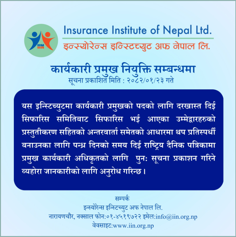 Kathmandu. The appointment process of the Chief Executive Officer (CEO) of The Insurance Institute of Nepal (IIN) has been delayed. IIN has again published the notice saying that there are not enough applications for appointment to the post of chief executive and there is no expected presentation from those in the short list.