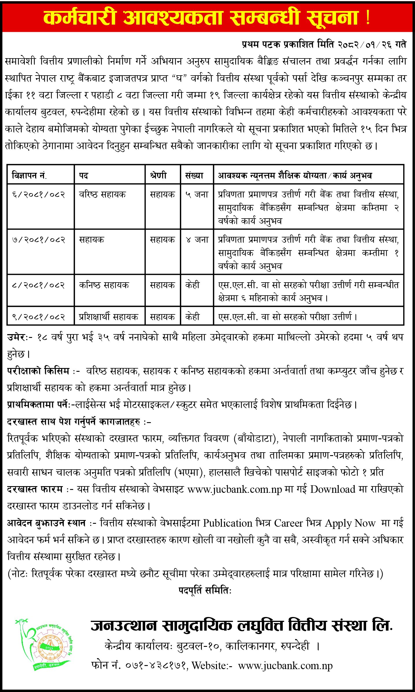 Kathmandu. There are now two days left to apply for the employees of various posts demanded by The Janautthan Community Microfinance Financial Institution. The organization has demanded five employees for senior assistant, four for assistant, some for junior assistant and some number for trainee. Interested and qualified candidates will have to apply by May 15.