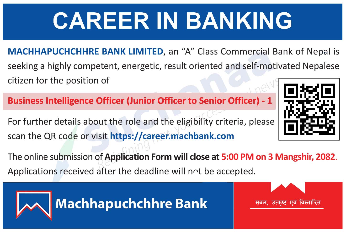 Kathmandu. Machhapuchchhre Bank has asked for employees. The bank has asked for employees for the post of Junior Officer and Senior Officer in Business Intelligence Officer. Those interested in applying for the post should apply before November 17.