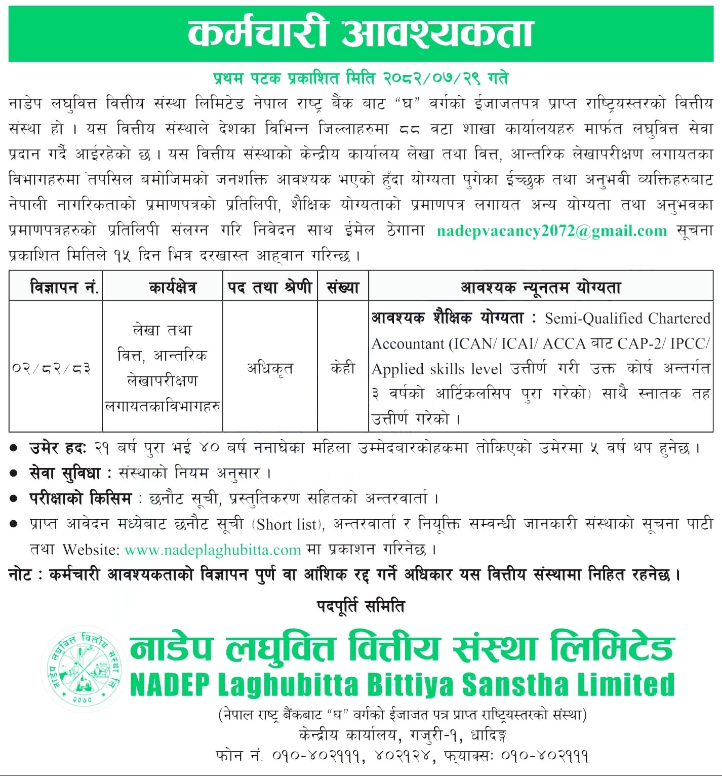 Kathmandu. NADEP Laghubitta Bittiya Sanstha has demanded employees. The organization has asked for employees for the post of officer for the departments of Accounts and Finance, Internal Audit and others. The applicant must have completed 21 years of age and not more than 40 years of age. In the case of women, the age will be increased by 5 years. The services and facilities will be as per the rules of the organization. Eligible candidates can apply to the post through the prescribed format within 15 days from the date of publication of this notice.