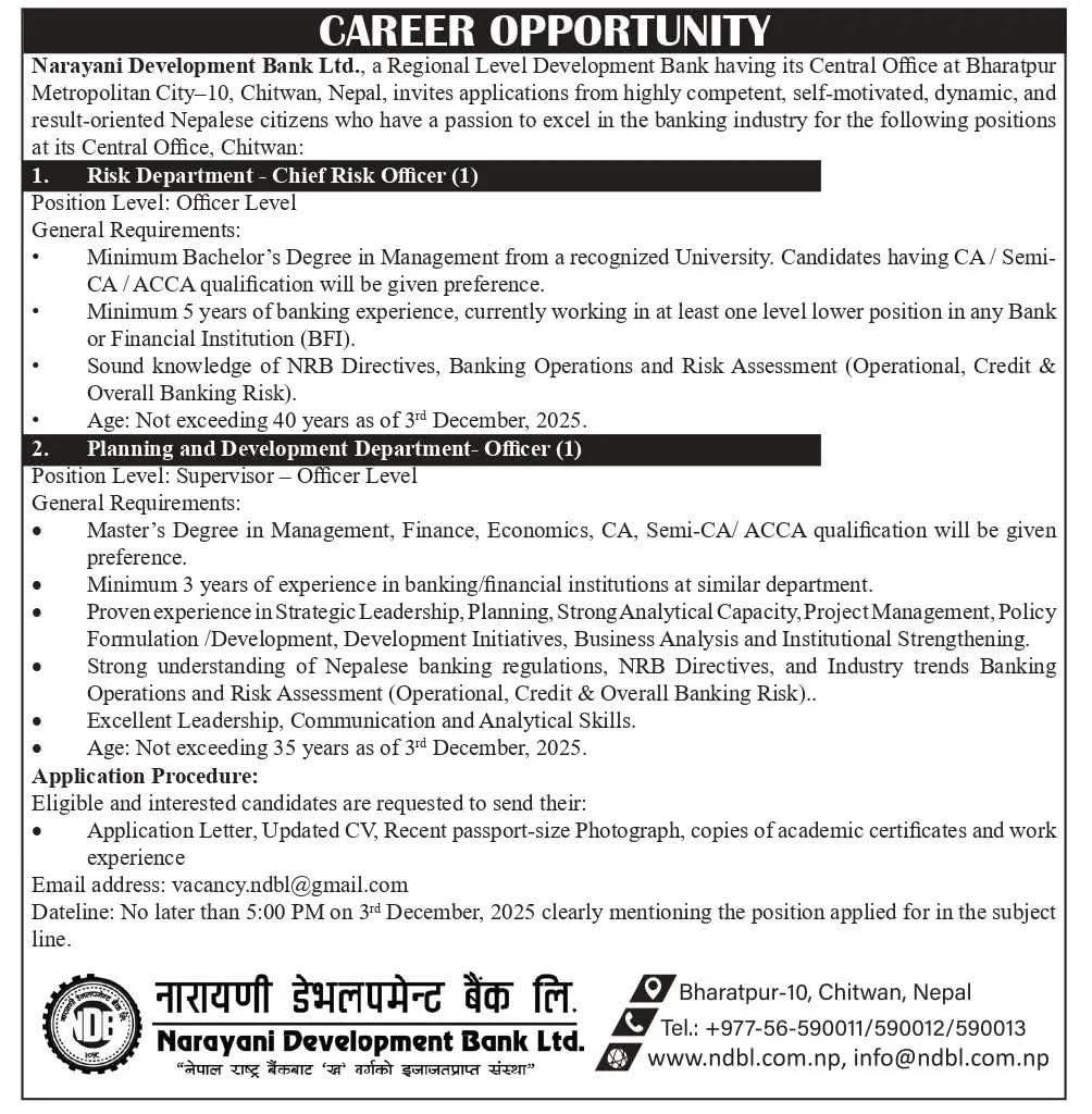 Kathmandu. Narayani Development Bank has demanded for its employees. The bank has asked for the post of Chief Risk Officer in the Risk Department and for the post of Officer in the Planning and Development Department. The bank has asked for employees for its central office and branch office. Those interested and eligible should apply for the application by December 1.