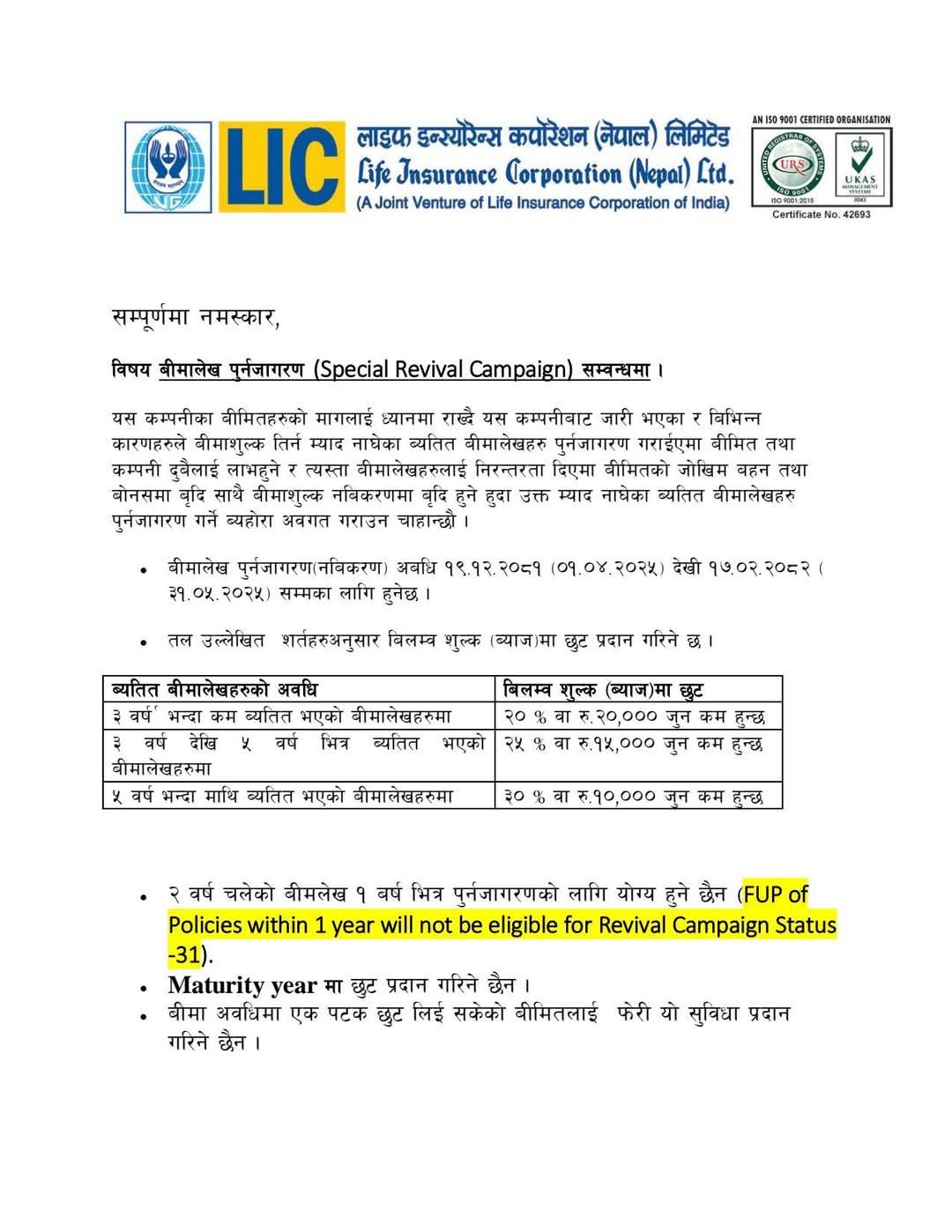 Kathmandu. Life Insurance Corporation (Nepal) has announced a huge discount on late fees for renewing lapsed insurance policies. According to the information received from the company, if the insurance policies that have been spent previously are resumed from 2081 Chaitra 19 to 2082 Jestha 17, the company has stated that a discount will be provided on the late fee charged on those insurance policies.