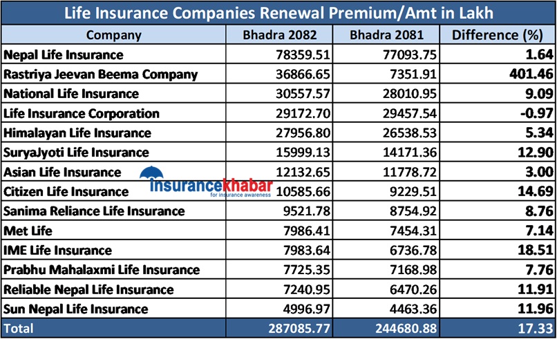 According to the data made public by the Nepal Insurance Authority, 14 life insurance companies have earned Rs 20.70 billion in renewal insurance premium till mid-August of the current fiscal year. Previous fiscal year 2081. Insurance companies had earned Rs 24.46 billion in renewal insurance premiums till mid-August 2018. The renewal premium has increased by 17.33 percent in the review period compared to the previous year.